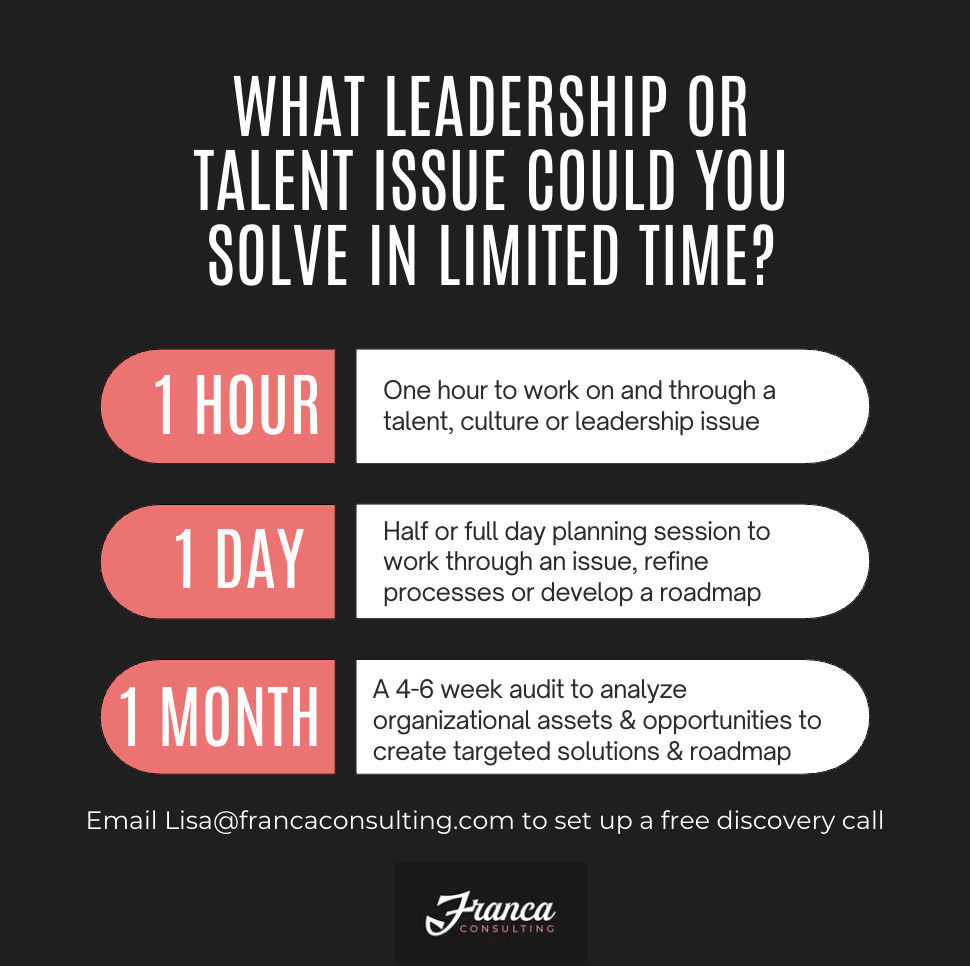 Do you have capable team members but are lacking bandwidth to set strategic vision or action planning around recruitment, talent development, culture or engagement? I’ve designed a few packages that allow busy leaders to get focused strategic support that their teams can then run and implement. If this sounds like something you’re interested in, email me at [email protected] or set up a time to talk here.